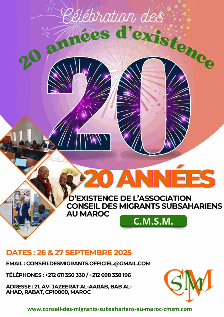 Le Conseil des Migrants Subsahariens au Maroc (C.M.S.M.) célèbre, en septembre 2025, ses 20 années d’existence. Créée en 2005 par des migrants originaires de plusieurs pays d’Afrique subsaharienne (Côte d’Ivoire, Guinée, Gabon, Cameroun, Mali, Burkina Faso, Nigeria, Togo, RDC…), l’association a grandi en s’appuyant sur un idéal commun : défendre la dignité, les droits et l’intégration des migrants au Maroc.