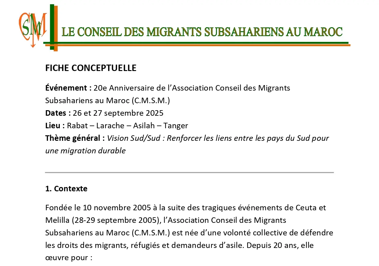 L’Association Conseil des Migrants Subsahariens au Maroc (CMSM) célèbre ses 20 ans d’engagement (2005 – 2025) dans la défense des droits des migrants, la promotion de l’inclusion sociale et la solidarité Sud-Sud.